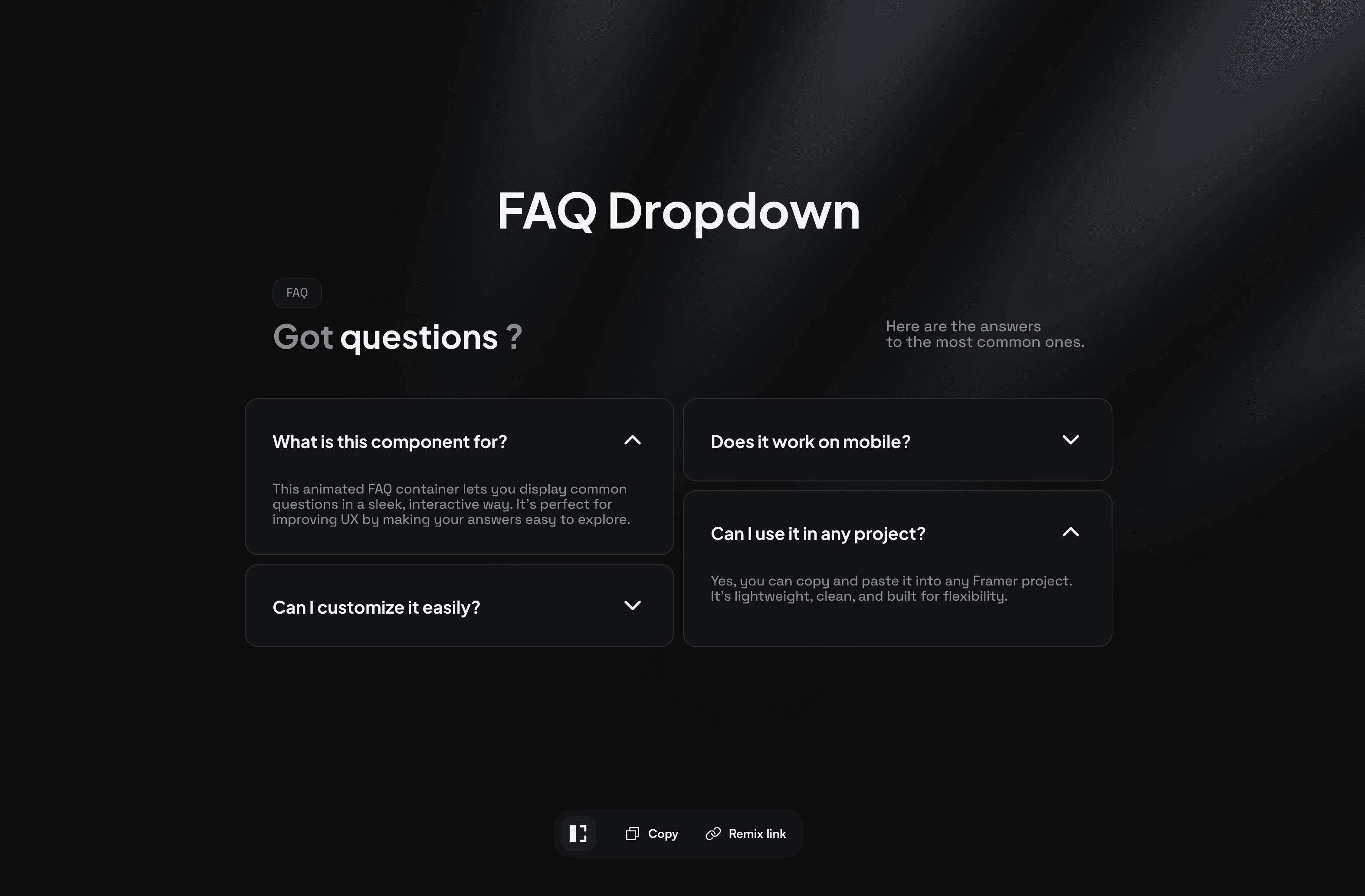 A ready-to-use FAQ section built in Framer. Easily customizable and perfect to answer common questions, improve UX, and build trust on any landing page. Thanks to Framer University for the Layout Jump Preventer Component !